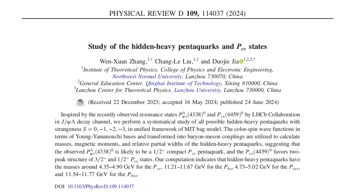 近日,以我中心物理教研室教授贾多杰为通讯作者,以青海理工学院为第二单位的研究论文Study of the hidden-heavy pentaquarks and Pcsstates发表于世界著名物理学术期刊《物理评论D》(Physical Review D,简称PRD)。