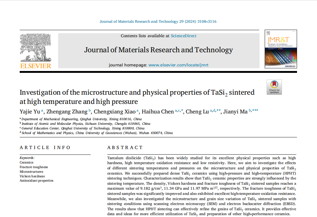 以通识教育中心陈海花教授为通讯作者,以学校为第三单位的研究论文Investigation of the microstructure and physical properties of TaSi2 sintered at high temperature and high pressure发表于SCI期刊《材料研究与技术》(Journal of Materials Research and Technology )。