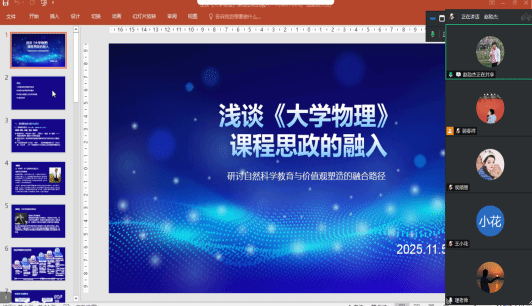 会议开篇,银龄教师赵勋杰在线上以《浅谈〈大学物理〉课程思政的融入》为题展开分享。结合多年教学经验,赵老师从物理学科的知识体系出发,深入剖析了课程思政的融入切入点 —— 既包括在经典物理定律讲解中渗透科学家的爱国情怀与严谨治学精神,也涵盖在实验教学中引导学生树立科学伦理与责任意识。随后赵老师分享9个思政点融入的实例,为在场教师打开了课程思政建设的新思路,也为后续《大学物理》课程思政教案优化、课堂设计完善提供了宝贵参考。