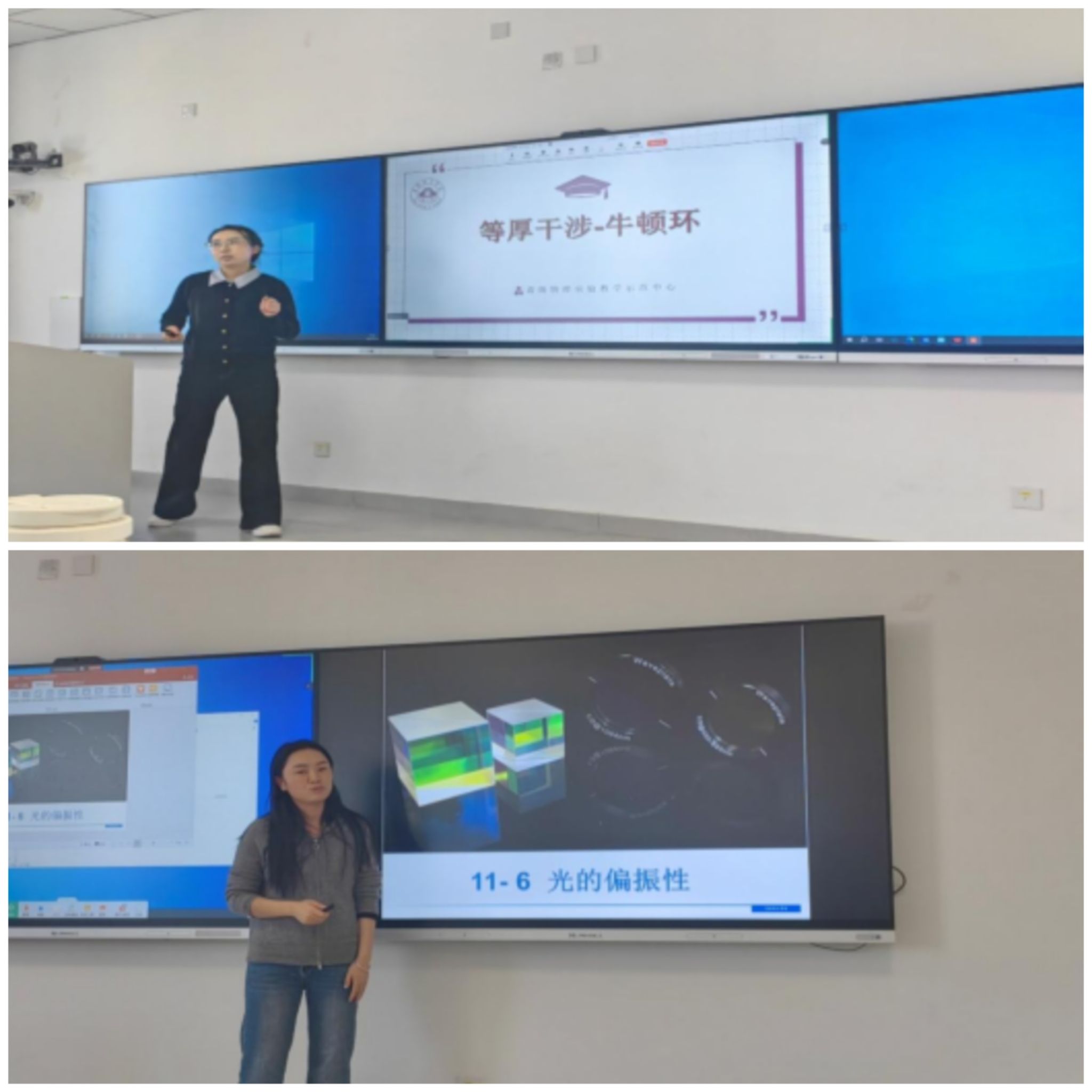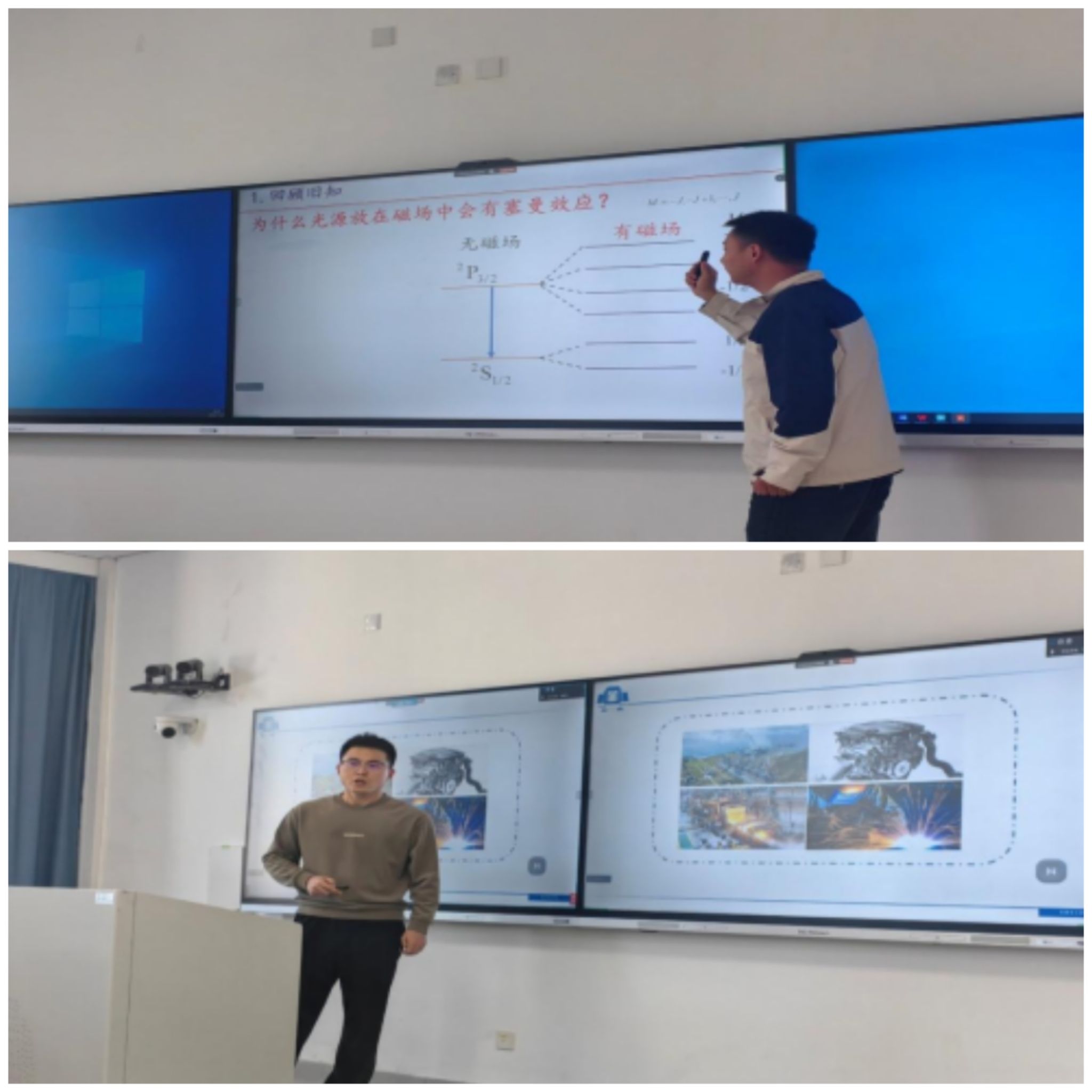 随后青年教师郭春祥、樊正鹏、李兵兵、王小花、侯顺丽 5 位青年教师依次进行讲课,围绕不同物理知识点展开“物理知识 + 思政元素”融合教学展示,各有亮点、各具特色。郭老师以“热力学热机效率”为主题,在讲解热机工作原理与效率计算的同时,引入我国新能源汽车发动机技术的自主研发历程,通过对比国内外技术发展差距与我国科研人员的攻坚故事,引导学生树立科技自信与创新意识;樊老师聚焦“平衡态和理想气体物态方程”,结合理想气体状态变化的严谨推导,穿插物理学家玻意耳、查理等坚持真理、反复实验的科学事迹,传递“严谨治学、追求真理”的科学精神;李老师解读“正常塞曼效应和反常塞曼效应”时,巧妙关联我国在量子物理领域的重大科研突破,如量子通信技术的应用,激发学生的民族自豪感;王老师讲授“光的偏振”时,从偏振光的特性出发,延伸至“坚守原则、明辨是非”的人生哲理,实现科学知识与价值观引导的自然衔接;侯老师以“等厚干涉牛顿环”为切入点,在演示实验现象、讲解干涉原理的过程中,强调实验操作的规范性与耐心细致的重要性,培养学生的工匠精神。