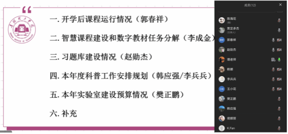 为全面推进新学期教学与科研工作高质量发展,3月19日19:00,物理教研室组织召开了本学期第二次教学工作线上专题会,会议围绕教学运行、智慧课程建设、习题库开发、科普工作规划及实验室建设等核心议题展开深入研讨与系统部署。