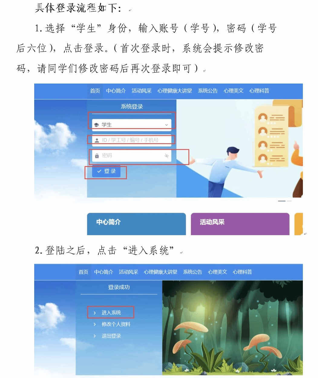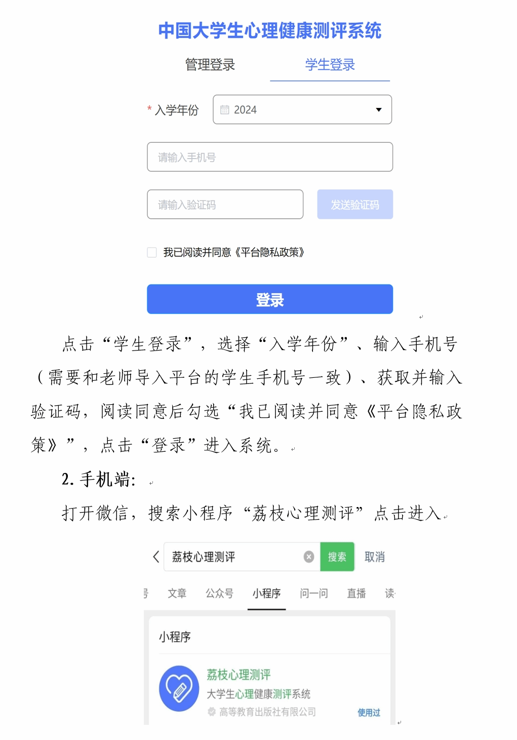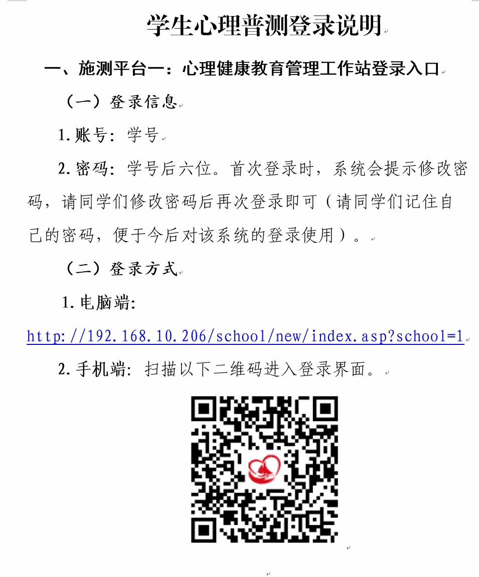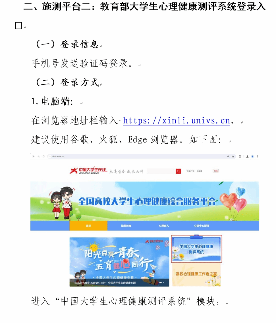 本次普测共两个平台,分别为:学校“心理健康教育管理工作站”和教育部“中国大学生心理健康测评系统”,需依次进入平台进行相应测评。具体操作内容详见附图。